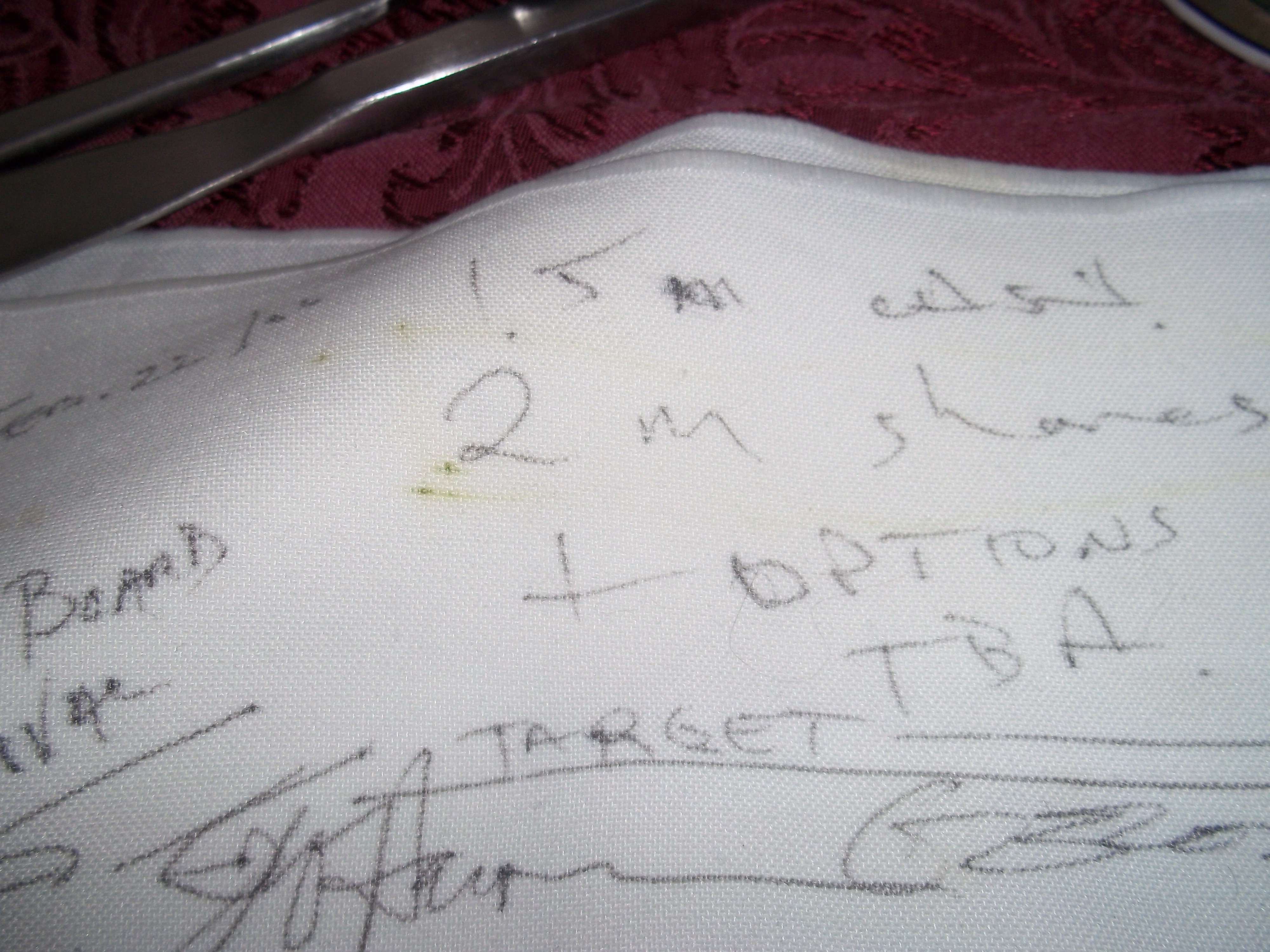 So when I unexpectedly came across a 10 year old dinner napkin on which the hastily scribbled out details of a multi-million dollar agreement provided reminiscent testimony of a time unlike any other, I could not help but smile thinking about the wild west adventure that was the dot com boom (and eventually bust).
