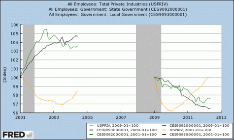 Certainly the fact that private sector payrolls have been expanding during this same period of public sector decline (see graph below), lends some creditability to this assessment. However, some might more reasonably conclude that instead of representing a decline, the shedding of public sector jobs is in reality a correction resulting from government overspending (or inefficiencies).