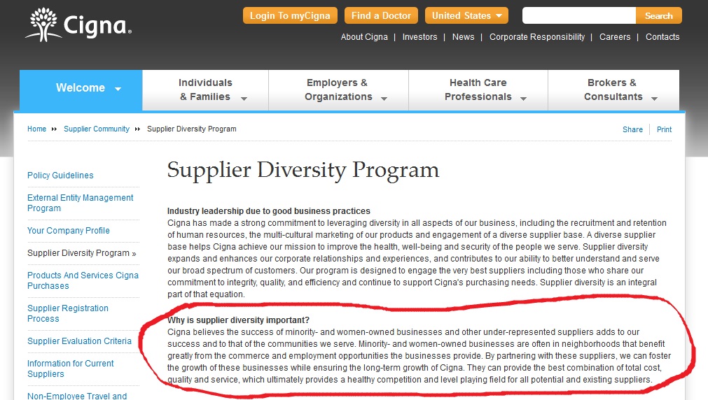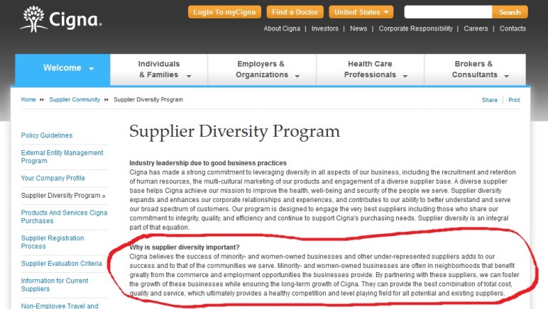 “the success of minority- and women-owned businesses and other under-represented suppliers adds to our success and to that of the communities we serve. Minority- and women-owned businesses are often in neighborhoods that benefit greatly from the commerce and employment opportunities the businesses provide. By partnering with these suppliers, we can foster the growth of these businesses while ensuring the long-term growth of Cigna. They can provide the best combination of total cost, quality and service, which ultimately provides a healthy competition and level playing field for all potential and existing suppliers.”