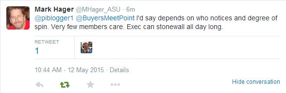 When I Tweeted “Doesn’t that come back to bite them i.e.lost creditability for the association = loss for the profession?”, Hager responded; “I’d say depends on who notices and degree of spin. Very few members care. Exec can stonewall all day long.”