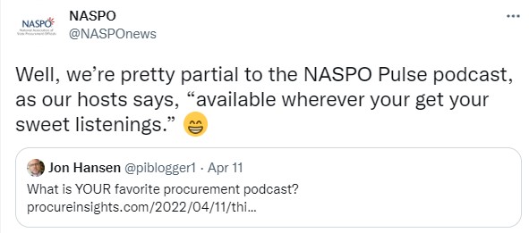 Something interesting happened on my way to review the remaining 18 podcasts from the FeedSpot list – a Tweet from the good people at the National Association of State Procurement Officials, otherwise known as NASPO.