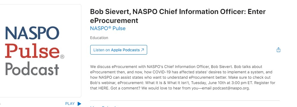 The podcast that came up featured the NASPO CIO Bob Sievert talking about eProcurement and his upcoming webinar on June 10th – eProcurement: What It Is & What It isn’t. By the way, to the show’s producer, there wasn’t an active link to register for the webinar π