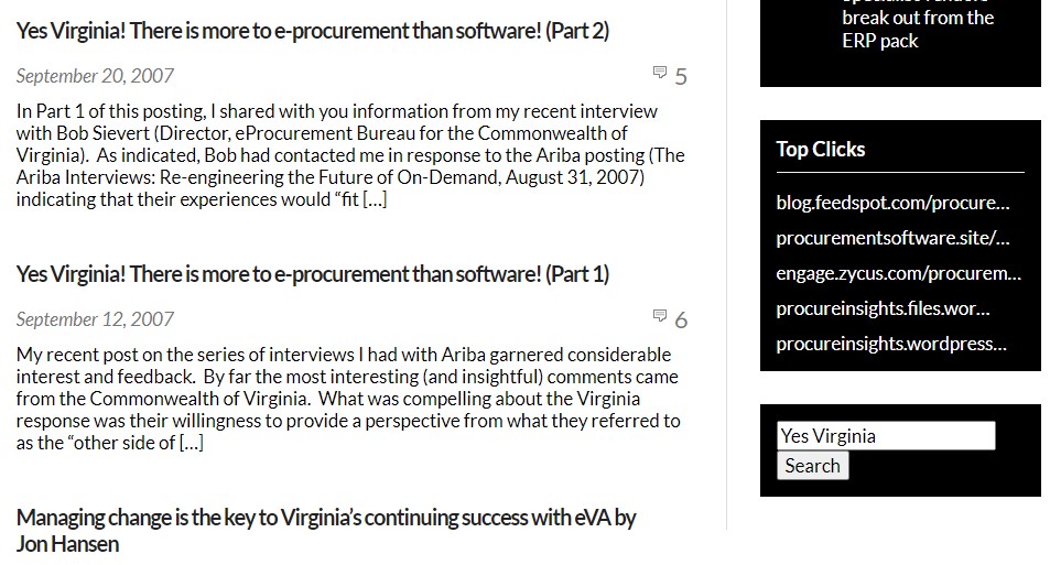Anyway, and this is the interesting part – one of the very first posts I wrote after launching this blog in May 2007 was the two-part “Yes Virginia! There is more to e-procurement than software!” review of the Commonwealth’s eVA initiative.