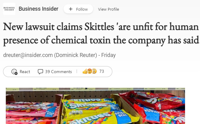 The July 15th, 2022 Business Insider headline read, “New lawsuit claims Skittles ‘are unfit for human consumption’ due to the presence of chemical toxin the company has said it would stop using.”