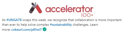 We’re investing in sustainable innovation and partnerships to help meet our #WorldWithoutWaste goals. Through the 100+ Accelerator program, a collaboration with AB InBev, Unilever, and Colgate-Palmolive, we’re working with startups around the world to identify solutions that we can pilot and scale to support a circular economy, water, and climate. – Coca-Cola Company LinkedIn post (October 2023)