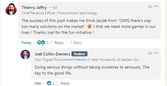 NOTE: The above comments for a Joel Collins-Demers post titled “ProcureTech March Madness” are fun but have an interesting underlying message per Thierry Jaffry’s comment.