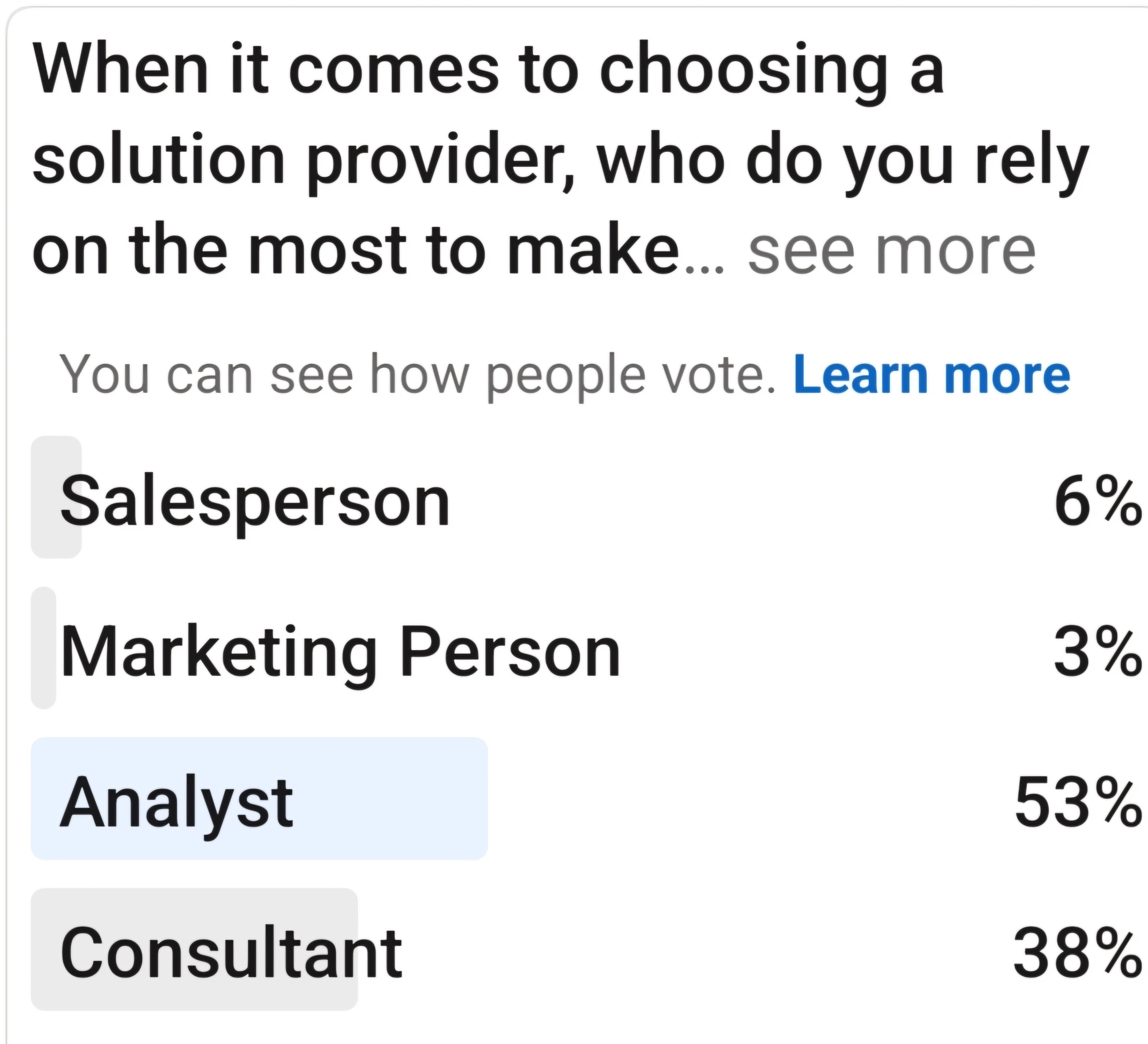 This is going to be a relatively brief post as I want the results of the LinkedIn poll to have center stage. The poll question is: When it comes to choosing a solution provider, who do you rely on the most to make the right decision?