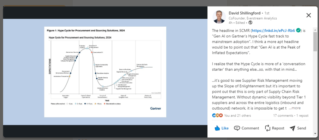 Here is a screen grab of a recent post on LinkedIn by Everstream’s David Shillingford regarding the Gartner Hype Cycle: