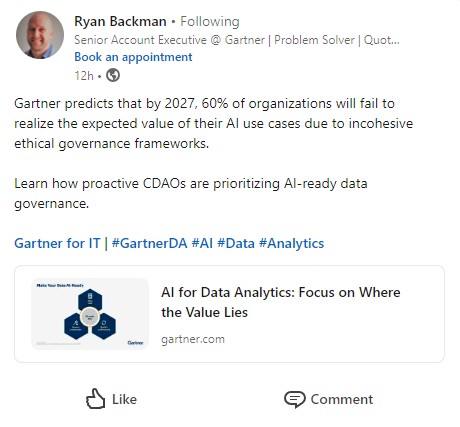 Gartner predicts that by 2027, 60% of organizations will fail to realize the expected value of their AI use cases due to incohesive ethical governance frameworks.