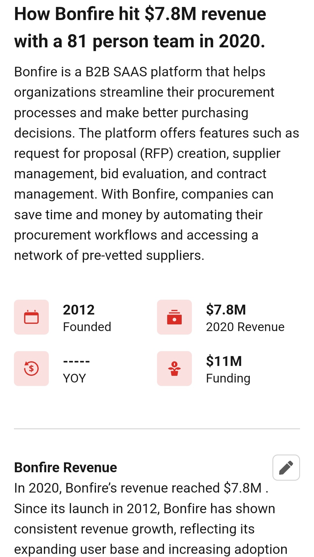 3. In 2020, the headline was “Bonfire Hit $7.8M Revenue with an 81-Person Team” that year.