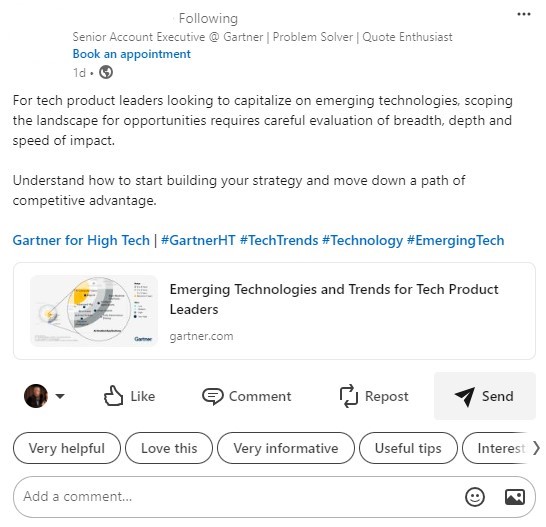 Unlike the McKinsey post, I took a screenshot of the original post by the Gartner representative, which I will share with you below. By the way, I removed the name of the individual who blocked me and removed the comments.