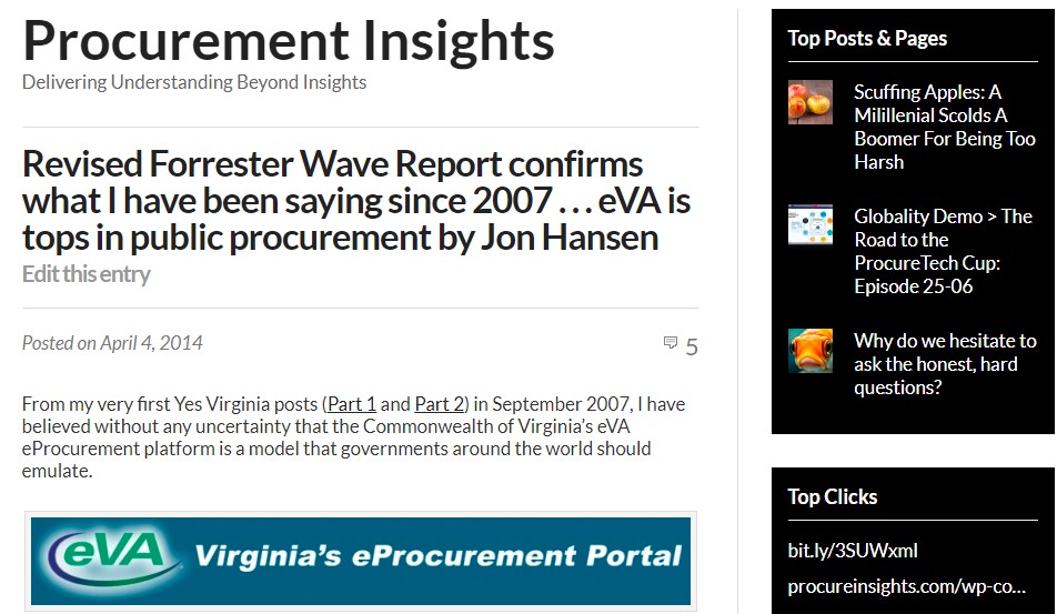 “As a result, they avoided the trap of eVA becoming a software project, as Bob put it, and were thereby able to shift the emphasis from an exercise in cost justification to one of process understanding and refinement. And while the Ariba application has done the job it was required to do, eVA’s effectiveness has little to do with the technology and more to do with the methodology the Virginia Brain Trust employed. When technology (nee software) is seen as the primary vehicle to drive results, it becomes ineffectual and mostly irrelevant. The 75 to 85% e-procurement initiative failure rate gives testimony to this fact.”