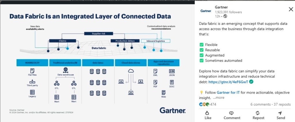 Here is the link to today’s Gartner post on LinkedIn regarding the Data Fabric graphic. My comment is below.
