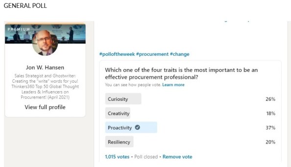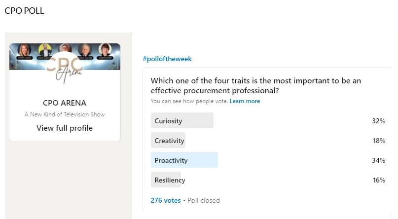 The following are the results of two Procurement Insights polls, which, at the time, I indicated was a small targeted sampling of the general procurement population and, with the second poll, specifically targeted at CPOs.