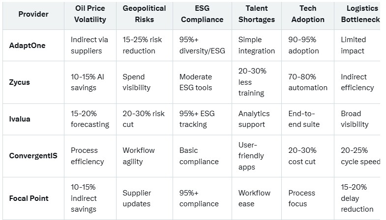 Chevron could pair AdaptOne/Focal Point for ESG and resilience, Zycus/Ivalua for scale and tech, and ConvergentIS/ProPurchaser for agility and skills, achieving $5M-$30M in total savings while blending Shared Services’ efficiency and RAM’s lean focus.