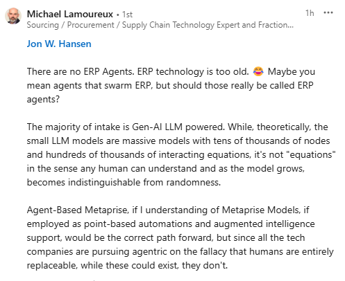 It didn’t take long to start to receive interesting comments on today’s earlier post, ERP Agent Swarms In The Age Of Intake And Orchestration And The Agent-Based Metaprise Model on LinkedIn, by another industry analyst.