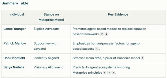 Hansen’s Agent-based Metaprise model finds explicit advocacy from Lance Younger and conceptual alignment from Satya Nadella and Patrick Marlow, while others like Rob Handfield validate its foundational requirements (e.g., clean data). The model’s decentralized, human-AI synergy resonates with broader industry shifts toward adaptive, agent-driven ecosystems.