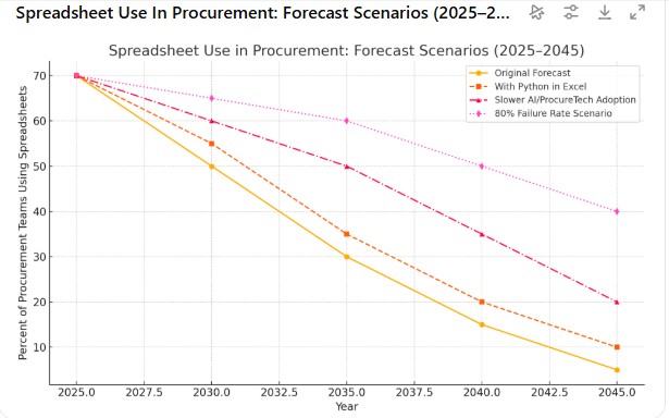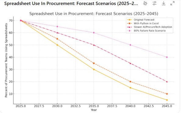 🤔 Original forecast with Excel alone 🤔 With Python in Excel 🤔 Slower AI/ProcureTech adoption 🤔 80% generational AI/ProcureTech failure rate