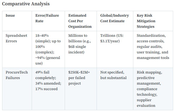 Root Causes Differ: Spreadsheet errors stem from human oversight, while ProcureTech failures often result from misaligned processes or poor stakeholder collaboration.