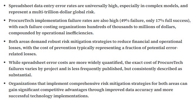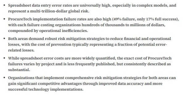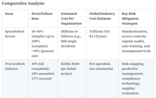 Organizations face significant risks in both manual spreadsheet reliance and ProcureTech adoption, underscoring the need for robust quality controls and strategic implementation frameworks