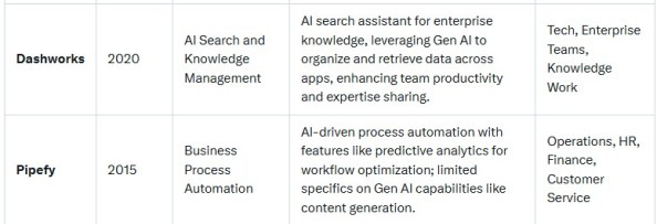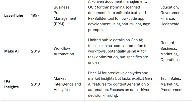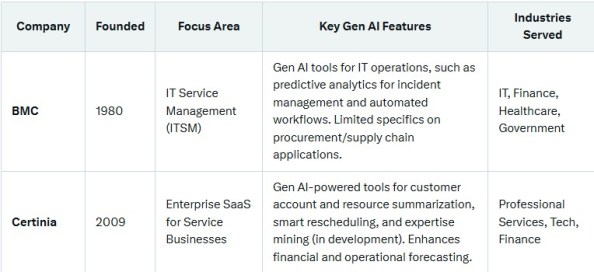 Below is a table comparing the seven Generative AI (Gen AI) companies—BMC, Certinia, Laserfiche, Make AI, HG Insights, Dashworks, and Pipefy—based on their founding year, focus area, key Gen AI features, and industries served. This comparison draws on available web information, focusing on their roles in procurement, supply chain, or related fields where relevant, while critically assessing their offerings.