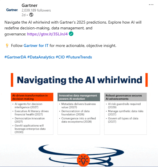 Result: Organizations faced shortages of staff with the data, technology, and AI skills needed to deliver on Gartner’s vision, slowing adoption and increasing reliance on external consultants or vendors.
