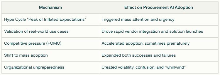 Gartner’s late-stage coverage of AI and procurement—specifically its focus on generative AI and agentic AI only after these technologies had already begun transforming the sector—accelerated and amplified the current AI whirlwind in several key ways: