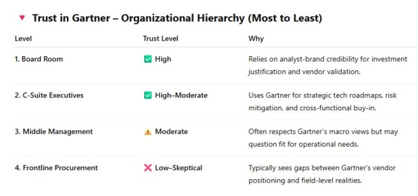 - Many CPOs and CIOs cite Gartner to justify shortlist decisions, even when internal teams express concerns about vendor suitability.