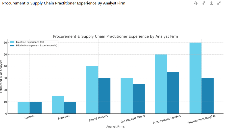 The percentage of Gartner analysts with frontline or middle management experience specifically in procurement and supply chain is estimated to be low—likely in the range of 10–15%. Here’s the breakdown: