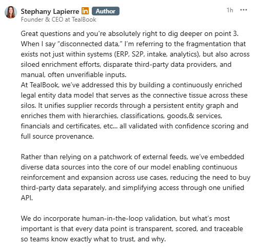 - Agent-Based Modeling Alignment – TealBook’s persistent legal entity graph** acts as a network of adaptive supplier agents. – These agents autonomously evolve through continuous enrichment and feedback from embedded data sources. – Human-in-the-loop validation mirrors Hansen’s hybrid agent- human collaboration principle. – Result: Procurement teams gain real-time, self-adjusting supplier intelligence.