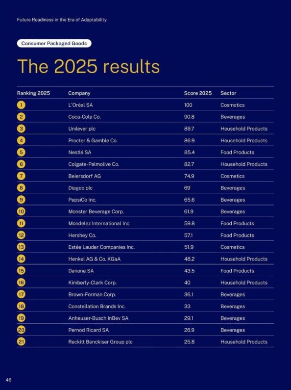 The listed companies, especially those with higher “Score 2025” values (e.g., L’Oréal SA, Coca-Cola, Unilever), are likely more successful in leveraging AI for consumer behavior tracking and product innovation than for procurement and supply chain efficiency. This reflects a broader industry trend where customer-facing AI offers quicker, visible returns, while operational AI requires longer-term investment and integration. However, without specific data on each company’s AI initiatives, this remains an informed estimate based on their innovation scores and industry patterns.