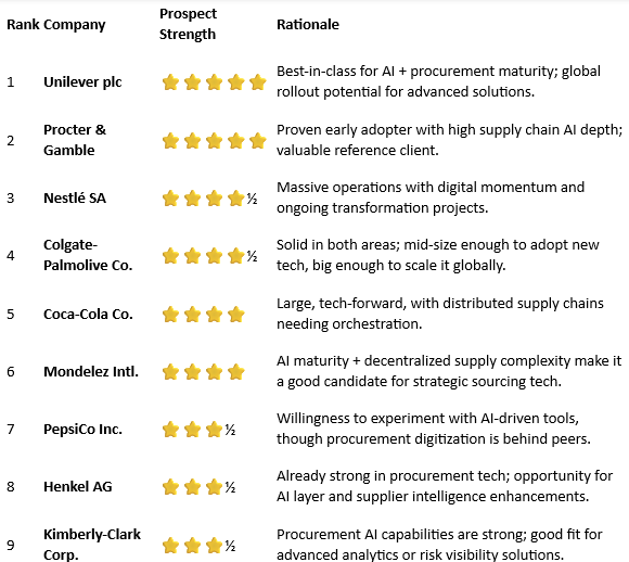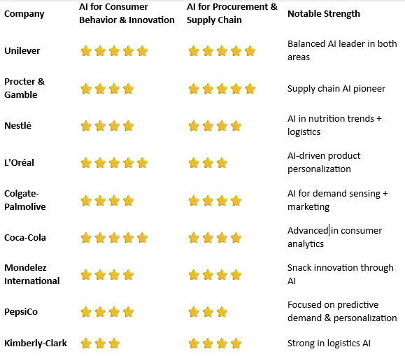 - Procurement-strong, consumer-light: Henkel, Kimberly-Clark, Colgate-Palmolive — Excel in back-office AI but slower to innovate on the consumer side.