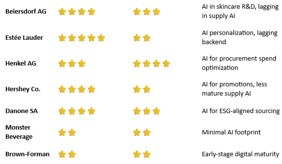 – Mondelez, Estee Lauder, and Danone are in the early adoption phase, especially in integrating AI across both dimensions, with growth potential through partnerships and pilots.