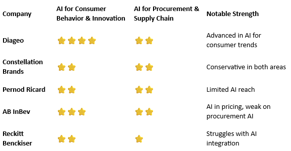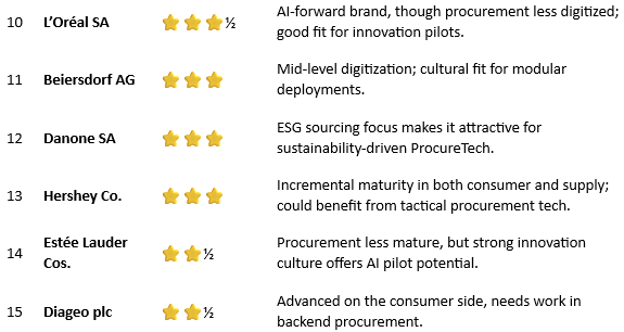 - Consumer-focused AI stars: L’Oréal, Estée Lauder, Diageo — Lead in personalization and customer insights but lag in supply chain and procurement digitization.