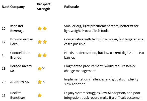 - Coca-Cola/PepsiCo (not listed in results) show stronger consumer tracking (IoT/AI analytics) than procurement automation based on available data.