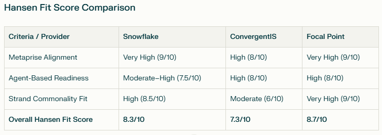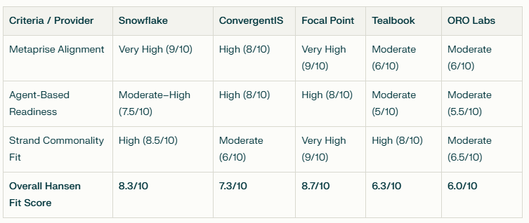 Snowflake also demonstrates strong alignment, especially in Metaprise and strand commonality, with an overall score of 8.3/10.