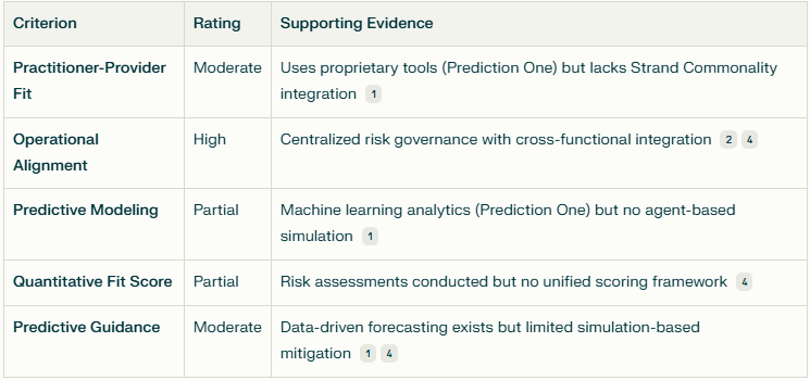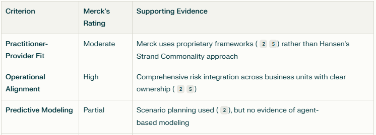 Merck would receive a Moderate overall Hansen Fit Score. While exhibiting advanced risk governance structures, the absence of Hansen’s core innovations—particularly Strand Commonality data integration and agent-based modeling—limits alignment with the framework’s predictive capabilities. The company’s risk management remains reactive rather than proactively simulation-driven as defined by Hansen’s gold standard.