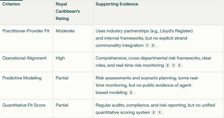 Based on the available information, Royal Caribbean International would likely receive a Moderate to High Hansen Fit Score. This assessment reflects robust operational alignment, advanced risk management frameworks, and a strong commitment to innovation and safety; however, there is limited evidence of full adoption of Hansen’s predictive, agent-based, and strand commonality methodologies.