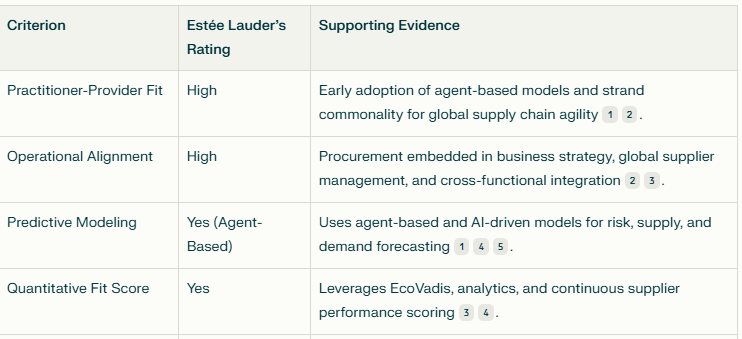 Estée Lauder ranks 5th globally on the 2025 Hansen Fit Score, reflecting strong alignment with the framework’s criteria and a high degree of digital procurement maturity. Here’s a detailed breakdown based on the Hansen Fit Score dimensions: