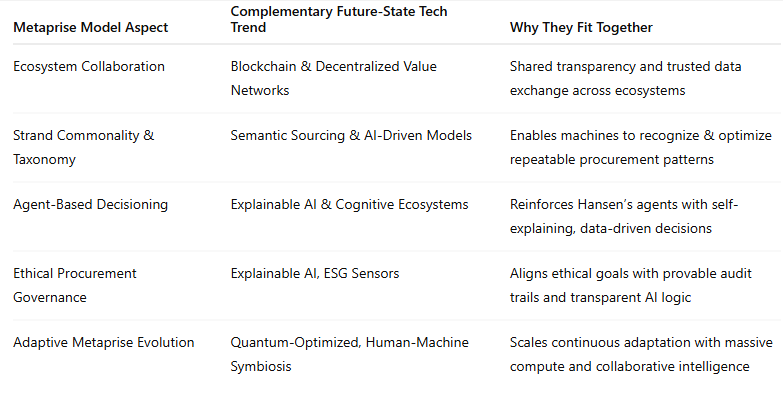 Hansen’s Metaprise, Agent-based, and Strand Commonality models establish the blueprint, while future-state tech trends provide the technological muscle — making procurement ecosystems smarter, faster, more ethical, and more resilient at every stage.