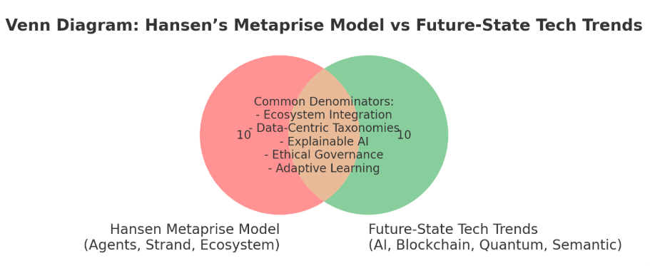 Here’s the Venn diagram illustrating the overlap between Hansen’s Metaprise model (Agents, Strand, Ecosystem) and Future-State Tech Trends (AI, Blockchain, Quantum, Semantic), with their shared denominators: