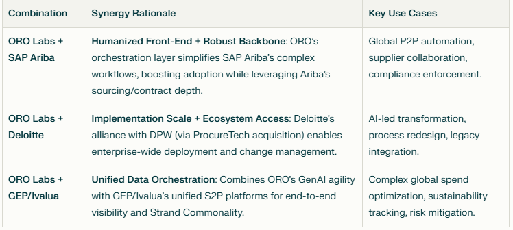 - Complementary strengths: ORO’s agent-based workflows + GEP/Ivalua’s spend analytics create closed-loop procurement intelligence.