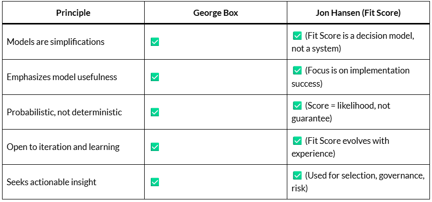 Hansen’s Fit Score does not claim to be absolute — rather, like Box’s philosophy, it’s meant to guide decisions better than chance or vendor bias.