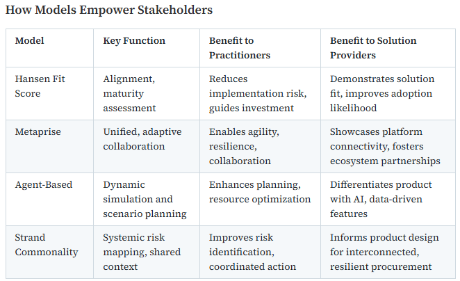 The Hansen Fit Score, and more specifically the Metaprise, Agent-based, and Strand Commonality models, position both procurement practitioners and ProcureTech solution providers to effectively respond to the challenges of the polycrisis era by transforming procurement into a more resilient, adaptive, and predictive function. This is achieved by addressing the root causes of technology implementation delays and failures, and enabling smarter, faster, and more ethically aligned procurement ecosystems.