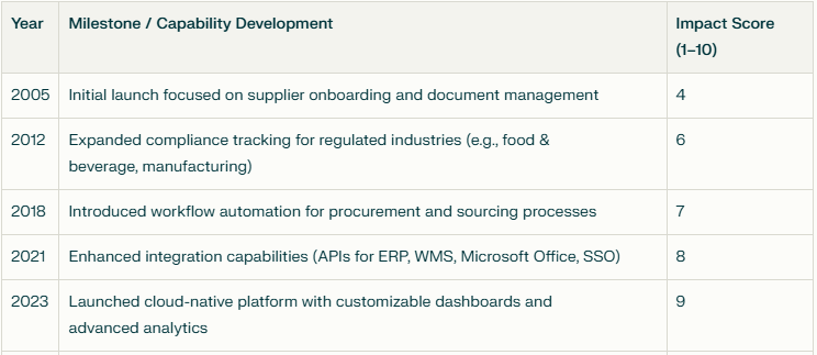 2012–2018: The platform expanded its compliance capabilities, supporting certifications and regulatory requirements (e.g., FDA, USDA). It also began to automate procurement workflows, reducing manual effort for tasks such as RFQs, approvals, and contract execution.