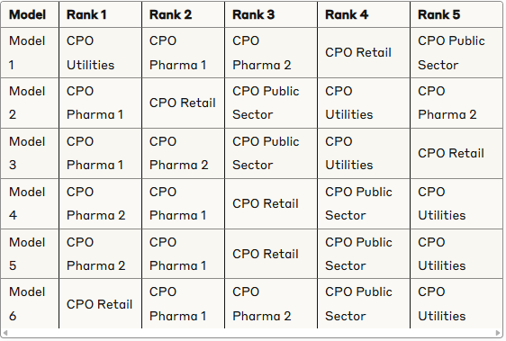 - CPO Utilities shows highest variance (Rank 1 in one model, Rank 5 in others)
