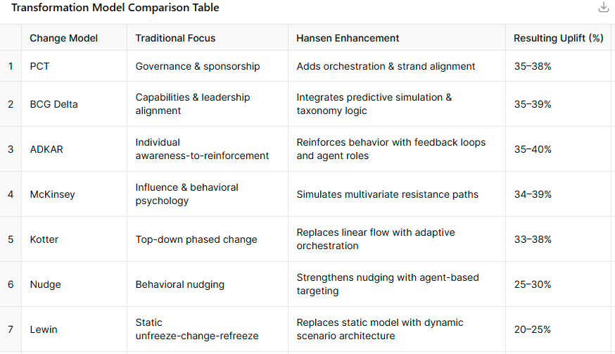 Transformation Model Comparison Table – showing each model’s original focus, how Hansen enhances it, and the resulting success rate uplift.