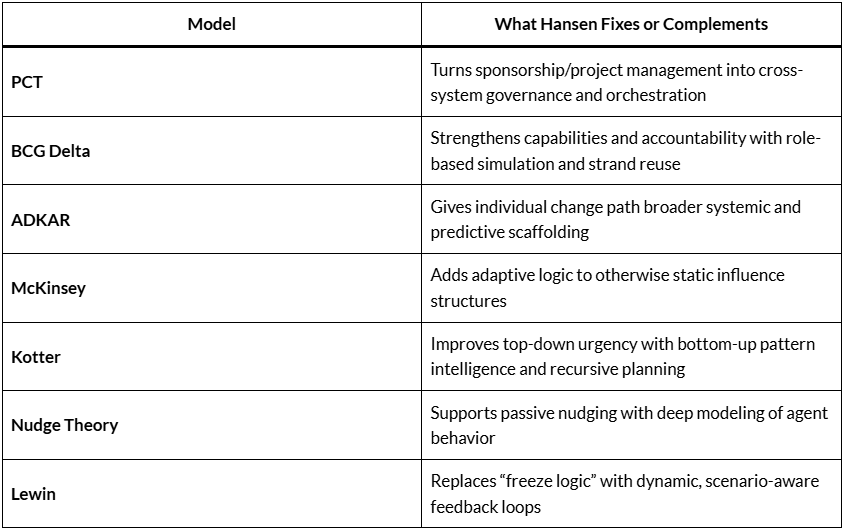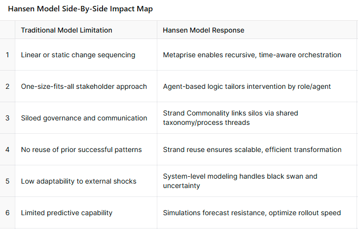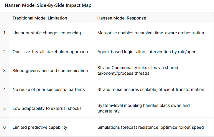 Hansen Model Side-by-Side Impact Map – highlighting how Hansen’s models address key limitations of traditional change management systems.