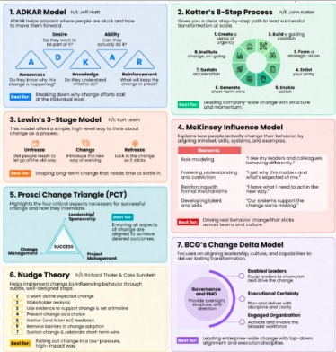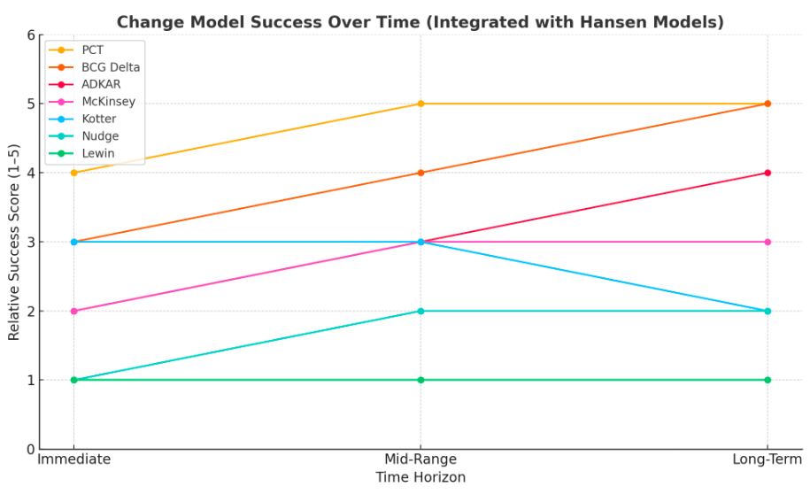 - ADKAR + Hansen optimizes change adoption and reinforcement, ideal when behavioral alignment is key.