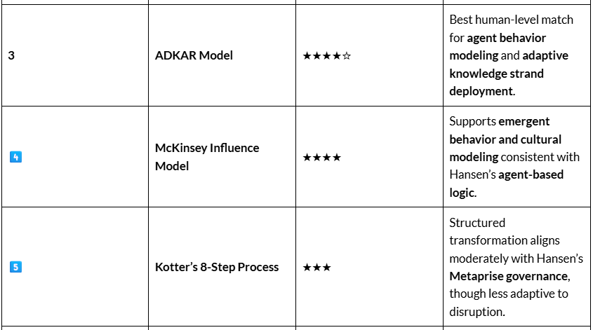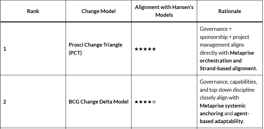 Based on the above image, here’s a ranked alignment (greatest to least) of the seven Change Management Models with Jon Hansen’s models—Metaprise, Agent-Based, and Strand Commonality—along with how these alignments translate into measurable strategic KPIs such as: